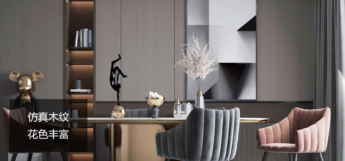 仿生ECO•木饰面板即免漆生态木饰面,以碳晶烯、碳纤维、纳米钙、介孔活性炭、竹炭等天然环保材料为基材,经高温合成科技形成复合环保材料基层,采用德国进口PUR热熔全自动热贴工艺高温压制而成,表面呈现天然原木质感。